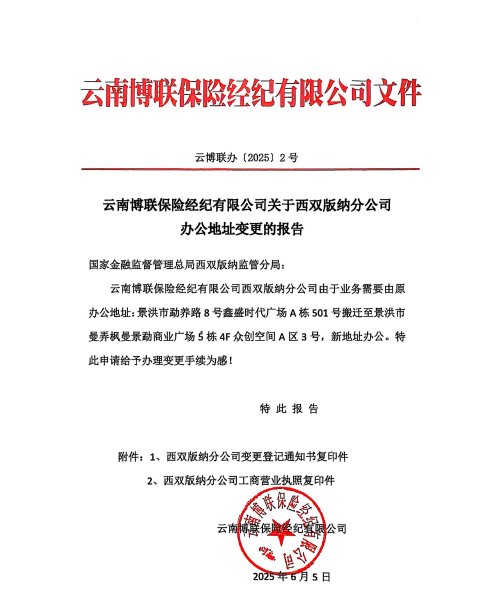 云南博聯(lián)保險經(jīng)紀有限公司關(guān)于西雙版納分公司辦公地址變更的報告